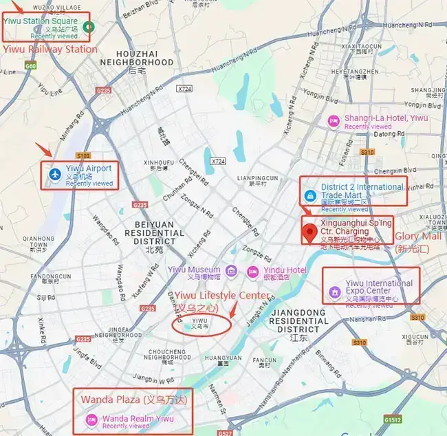 I’ve marked Yiwu Market, railway station, airport, Yiwu International Expo Center, and major shopping malls in red. This will help you choose the best hotel location in Yiwu more easily. Let’s take a look!